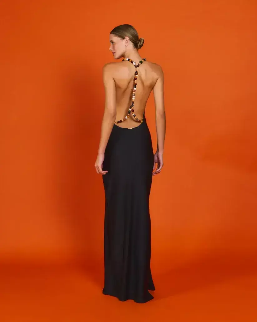 O diferencial da peça está no decote fechado na frente e nas costas totalmente abertas, conectadas por tiras trabalhadas com esferas multicoloridas em resina, que funcionam como alças e trazem um toque artesanal e exclusivo.